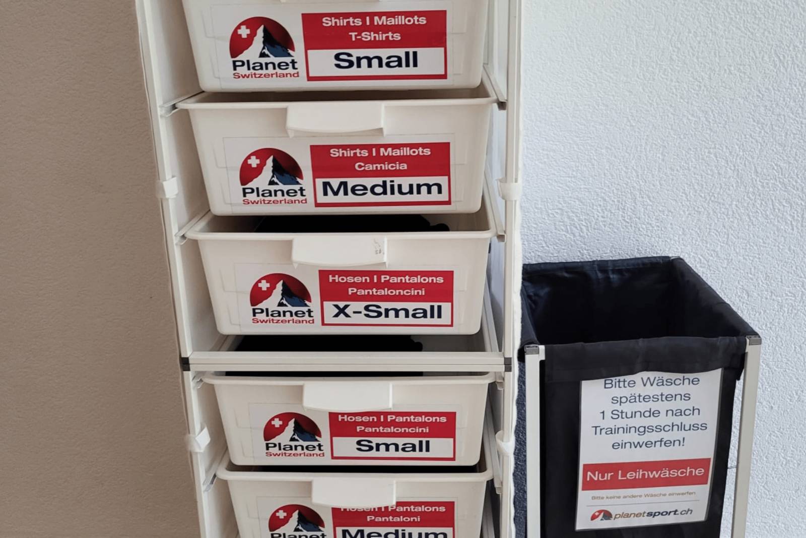Ich gehe noch schnell im Supermarkt vorbei, um Wasser zu kaufen, denn wir stellen auch Wasser für jedes Training bereit. Jetzt ist alles vorbereitet. Morgen früh werde ich in Engelberg sein und alles aufstellen.